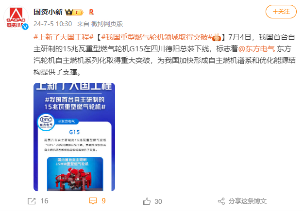 [国资小新]#我国重型燃气轮机领域取得突破#